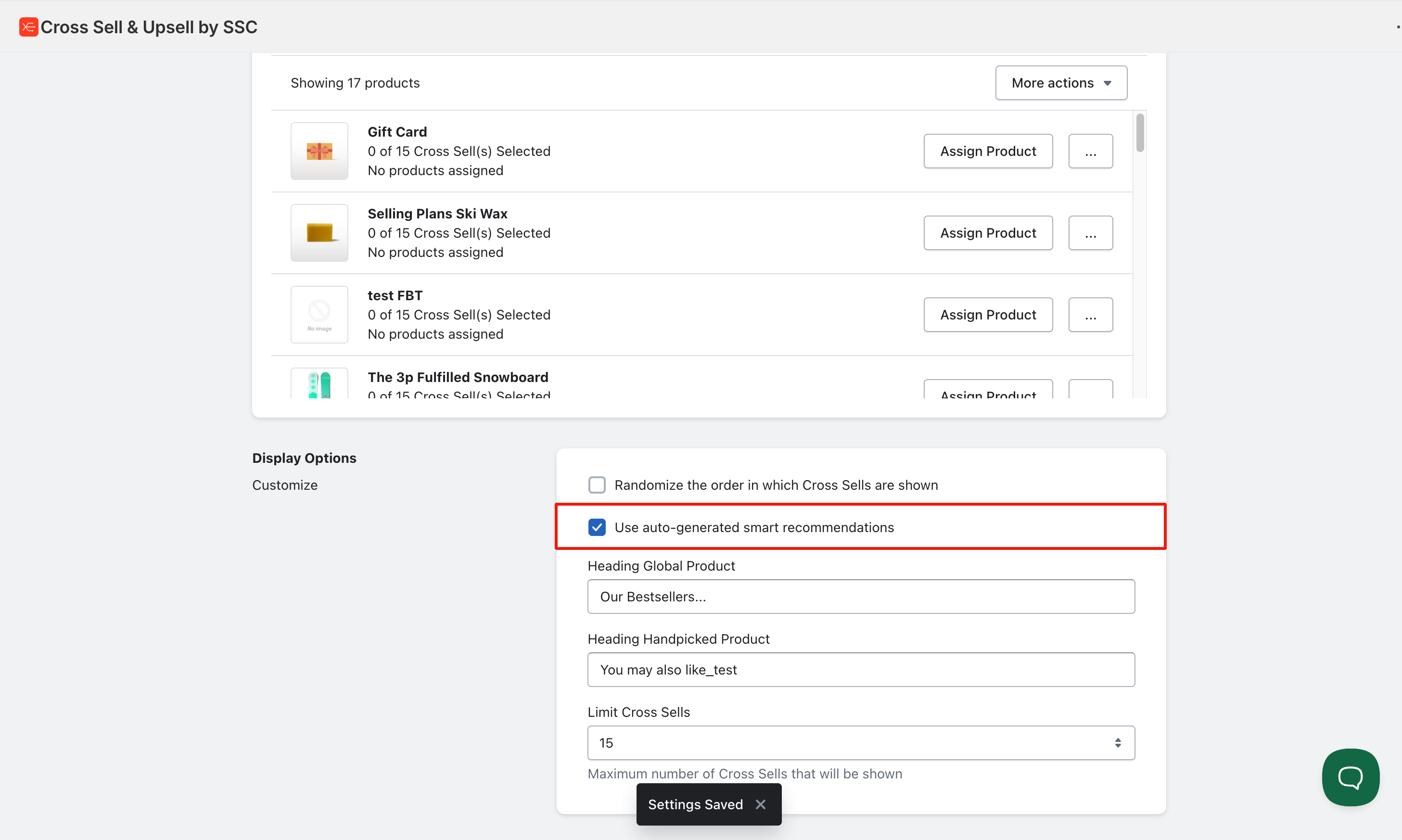 Once active, if Global Cart Cross Sells exists (or Handpicked Cross Sells are active & exist), they will be appended and shown with the auto generated recommendations. This behavior however is unpredictable, as Shopify might generate 3 or 15 "smart recommendations" based on its algorithm (and your Max Items setting). This is why we suggest clearing your "Global Product and/or Cart Cross Sells" in the Dashboard if using this option.