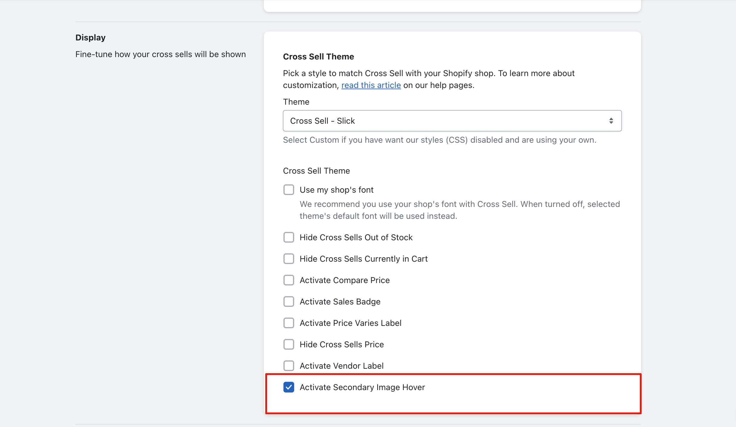 Have the second media/product image shown on your Cross Sells when hovered. To activate this feature, you will need to go to Settings then scroll down to the Display section and check the "Activate Secondary Image Hover".